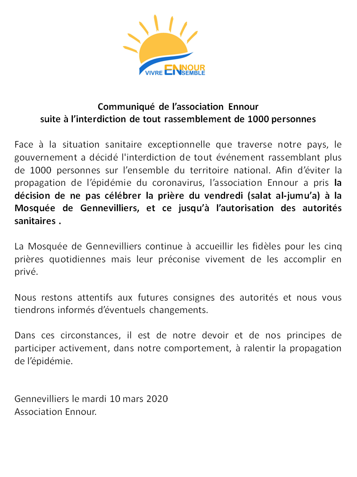 A LA UNEActualitéCommuniqués Communiqué du 10 mars 2020 Par Ennour - 10 mars 2020 2416 Partager sur Facebook Tweeter sur Twitter tweet